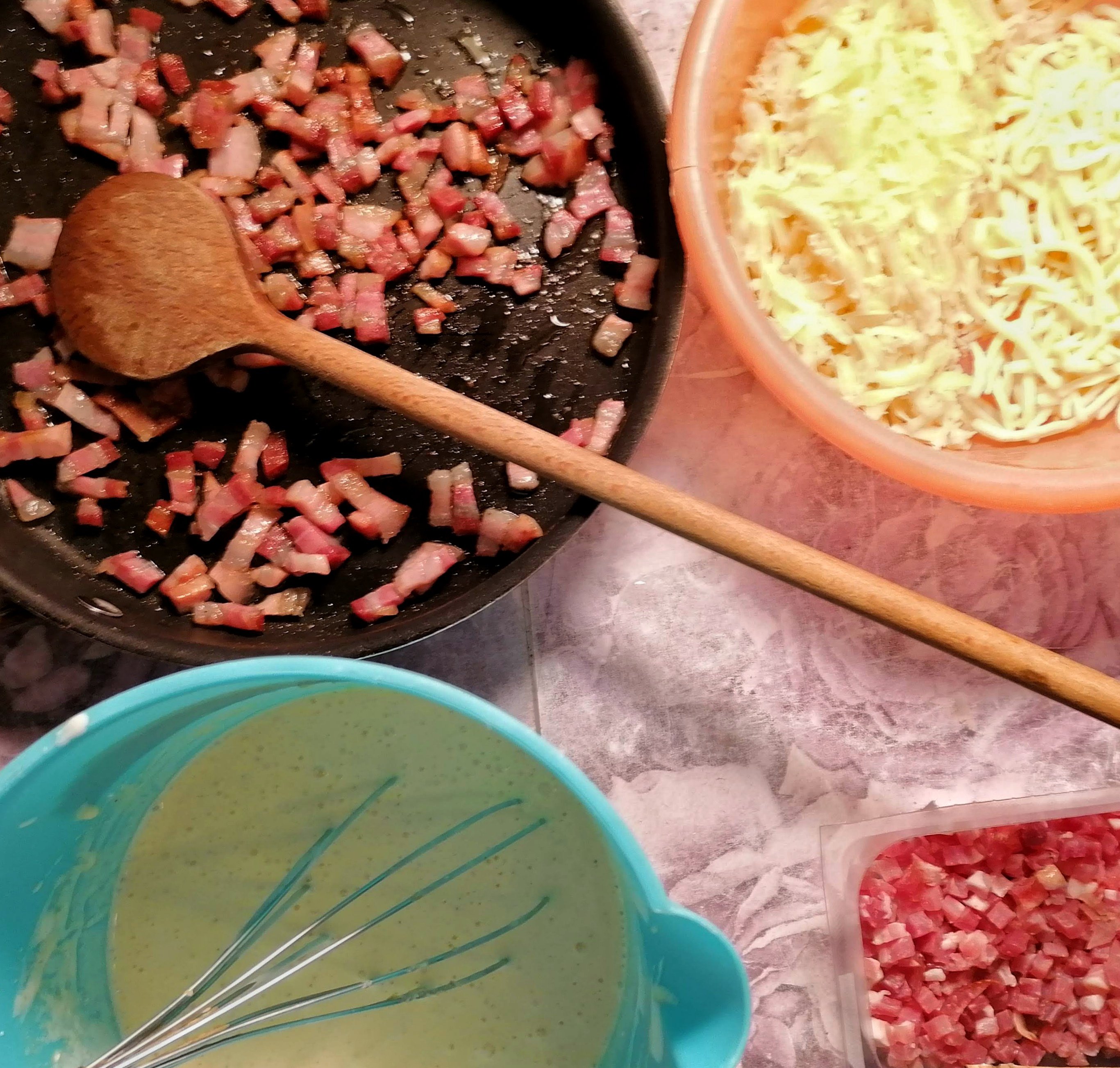 Take the crust out of oven, turn down the heat to 150 degrees Celsius. Spread the bacon and ham on the crust evenly, pour the migaine over it, sprinkle evenly with cheese. Return to oven, bake for 45 minutes. Turn the heat up back to 180 degrees Celsius, bake ca. 10 minutes more (until cheese is reddish golden). Serve and enjoy, bon appetit!