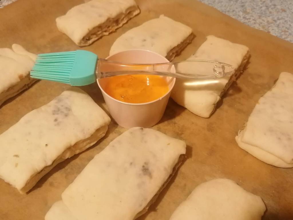 Roll out to a rectangle of about 1 cm thickness, cut into eights, or more traditionally in circles of about 7-8 cm in diameter (you can use a glass or cup to cut them out). Transfer to a baking tray covered with baking parchment. Beat the egg with the fork and coat the tops of the scones with a thin egg layer.