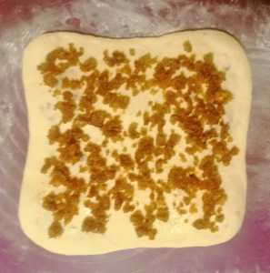 Roll out again to rectangle form, cover with remaining crackling-butter mixture. Fold again like in previous step, only now first fold top and bottom, then left and right. Press gently, cover, leave to rest again for 10 minutes.