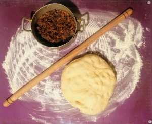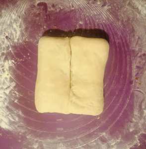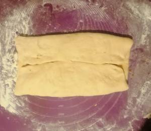 On a floured surface knead the dough, then roll out to a rectangle of about 5 mm thickness. Take half of the filling and evenly spread on top of the dough. Fold left and right to the center, without overlapping. Fold top and bottom to the center, again without overlapping. Flip and press slightly, cover and leave to rest for 10 minutes.