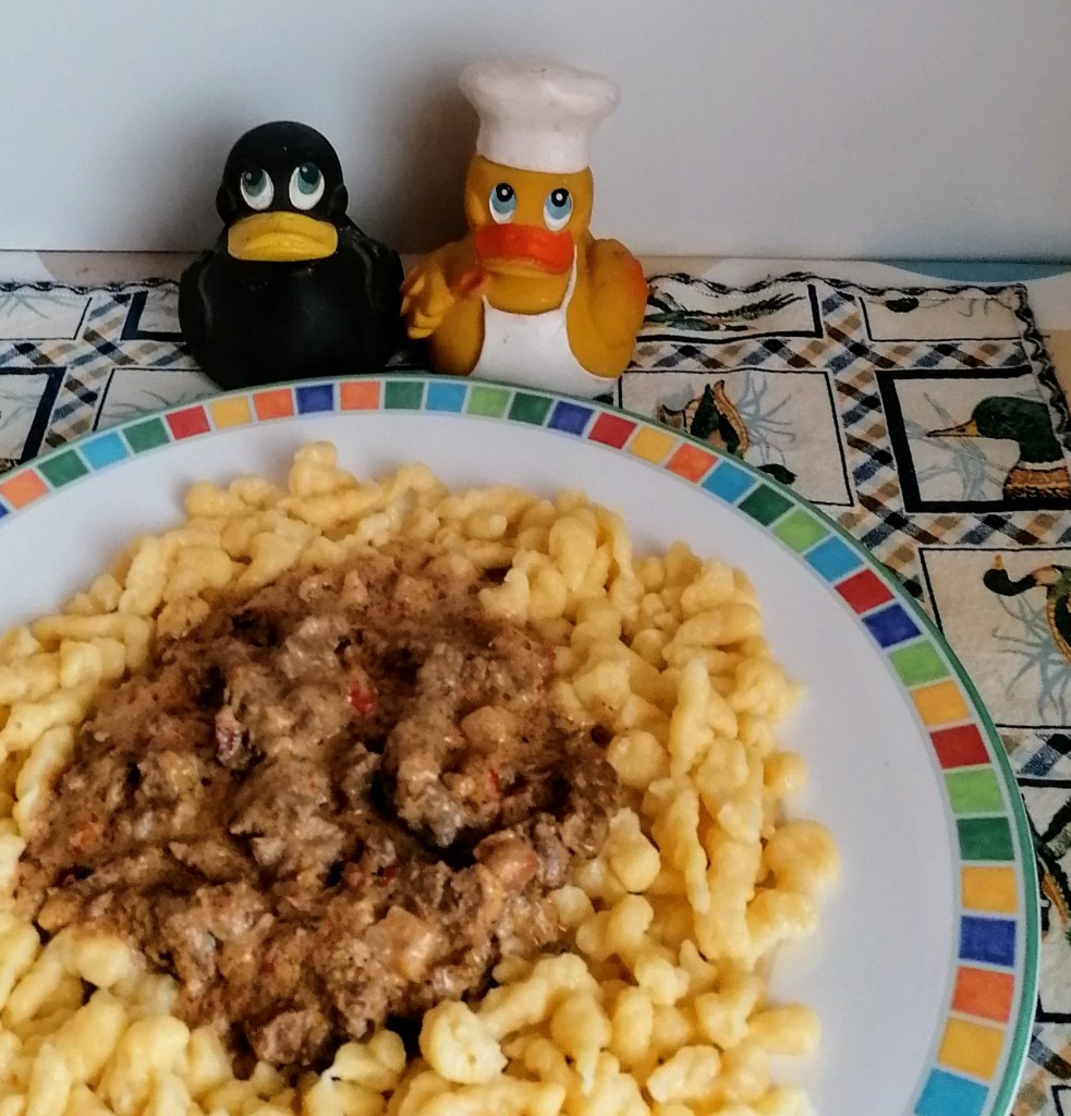 Spätzle are much consumed both in Baden-Württemberg and in Bayern (Bavaria). They can be a side-dish for meat dishes with sauce, or eaten as a main, most frequently baked with cheese and served with fried onions (Käsespätzle mit Röstzwiebeln, my personal absolute top one comfort food, soon I will share my recipe for that).