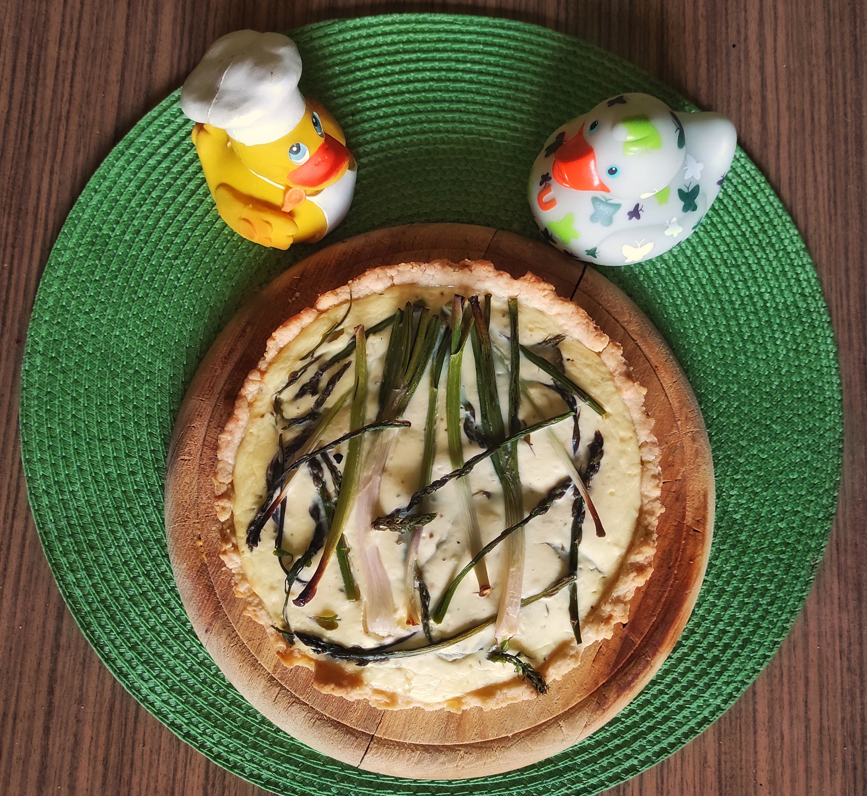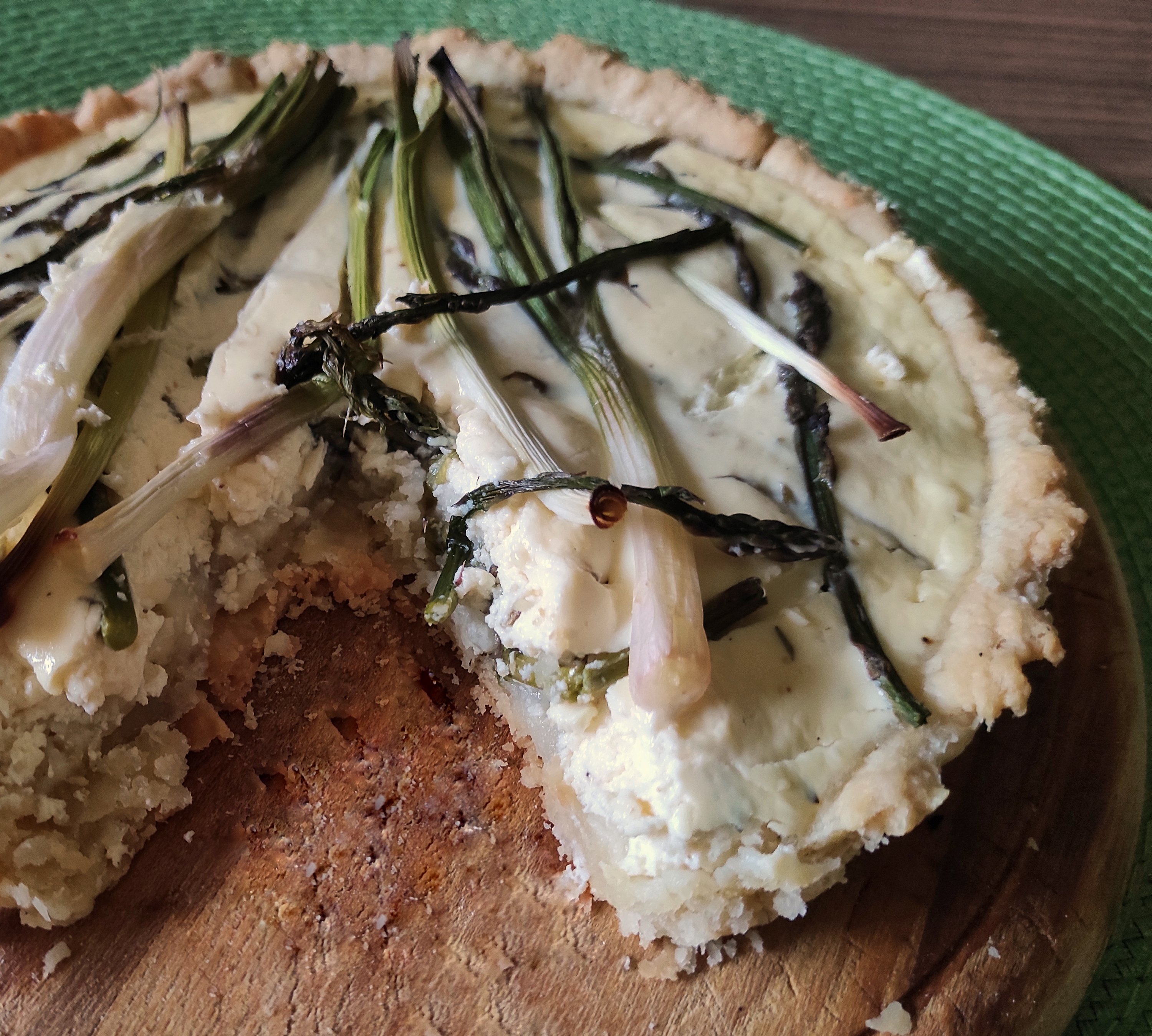 Note: You add the salad-type veggies (radishes, baby spinach, violet petals and similar) after baking. If you use raw veggies at the end, you can also sprinkle the tarte with selfmade vinaigrette (olive oil – vinegar mix with a little bit of mustard, salt and pepper).