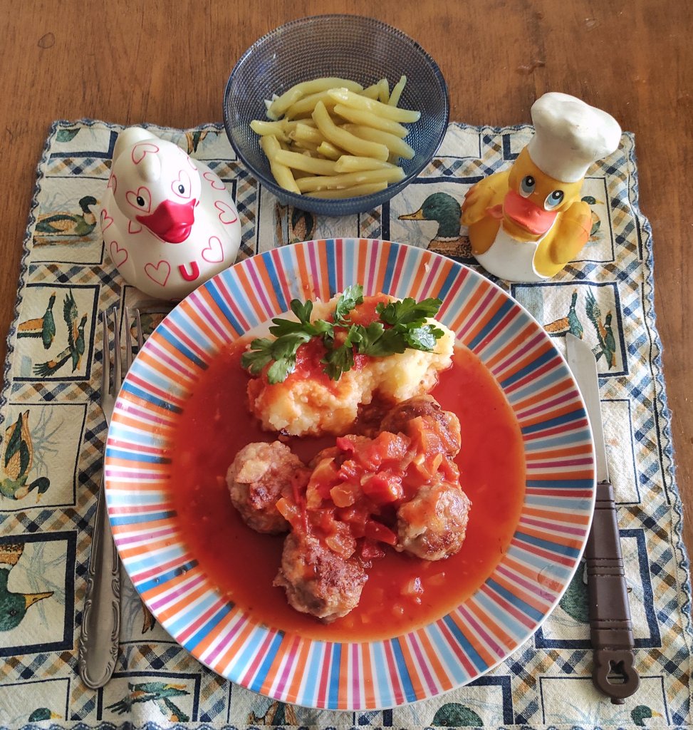 The polpet(t)e is particularly great in summer, when you can find tasty ripe tomatoes for the sauce, but of course you can make it with canned ones at other times of year. It is a bit of work, but no advanced cooking skills are necessary, and it’s really worth a try, particularly since it is equally as good reheated a day after it was made.