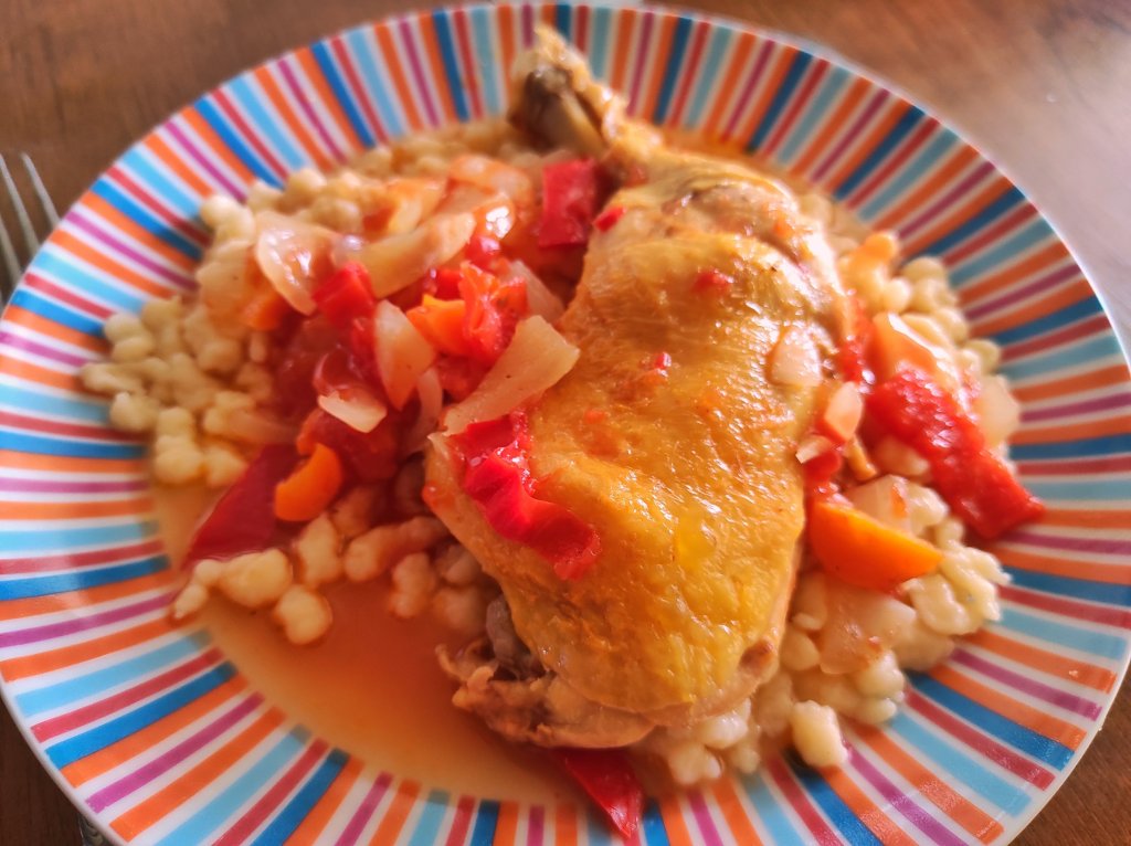 It is very important to use, at least partly, chicken pieces with bones and skin – only filets will not give enough taste. Also, the better peppers and paprika powder you find, the tastier it will be. In any case, this is a dish worth making in a big batch, as like most stews it gets better a day or two after making. As a side dish, any short pasta will do (I made German Spätzle); boiled or mashed potatoes also work well with this.