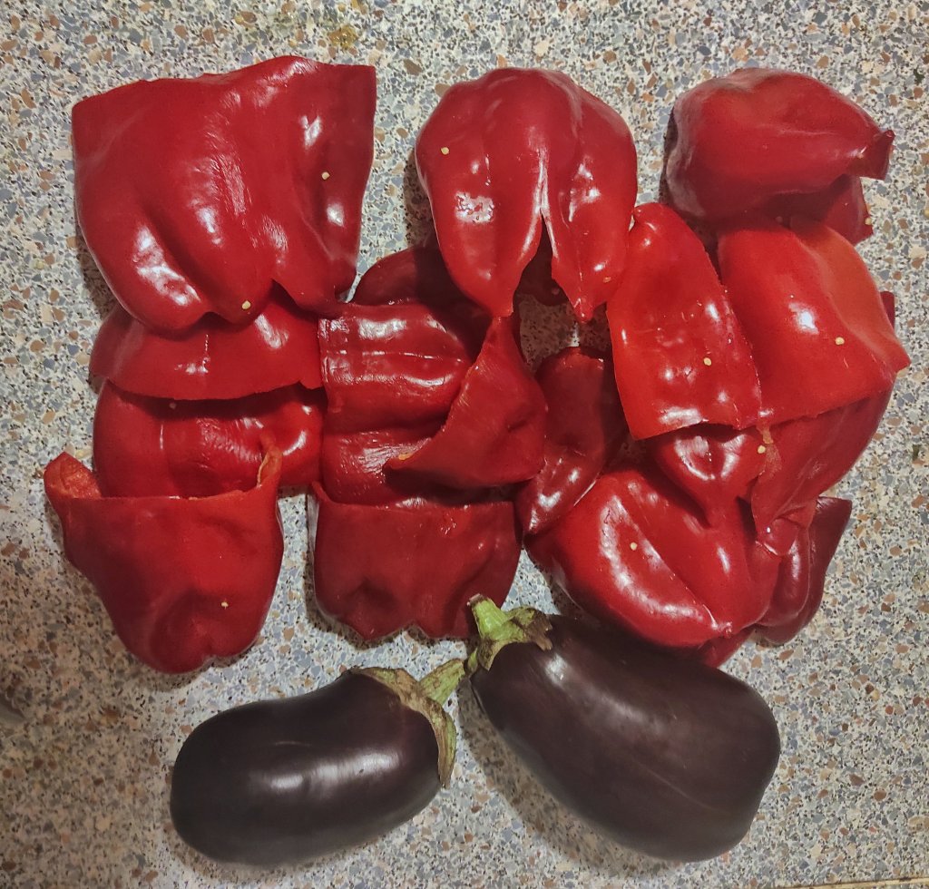 5-6 kg red pointy peppers (make sure they are of good quality with thick flesh), 1-1.25 kg aubergines, ca. 750 g onions, 5-6 garlic cloves, ca. 500 ml sunflower oil, 1.5 tbsp salt, 1 tbsp sugar, 2 tsp black pepper