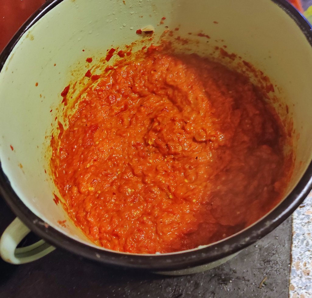 7. Fill the hot ajvar into sterilised jars, close, turn upside down for half an hour. Then keep in a cool dark place (keeps for several months). After opening keep in fridge and use in a few weeks.