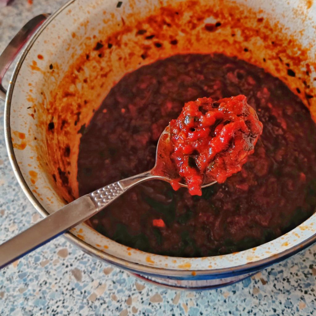 Continue cooking (lid off!) on low to medium heat, stirring every few minutes, until reduced to a thick sauce. It takes about 2 hours of cooking, and you know it is done when you stir but “see the bottom of the pot”, meaning that when you stir the mixture, it does not immediately cover the pot, but you can see the bottom for a few seconds.