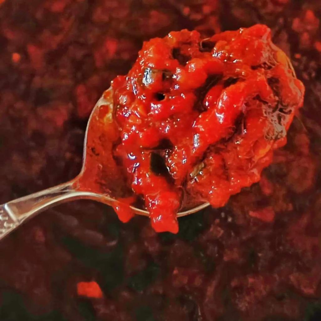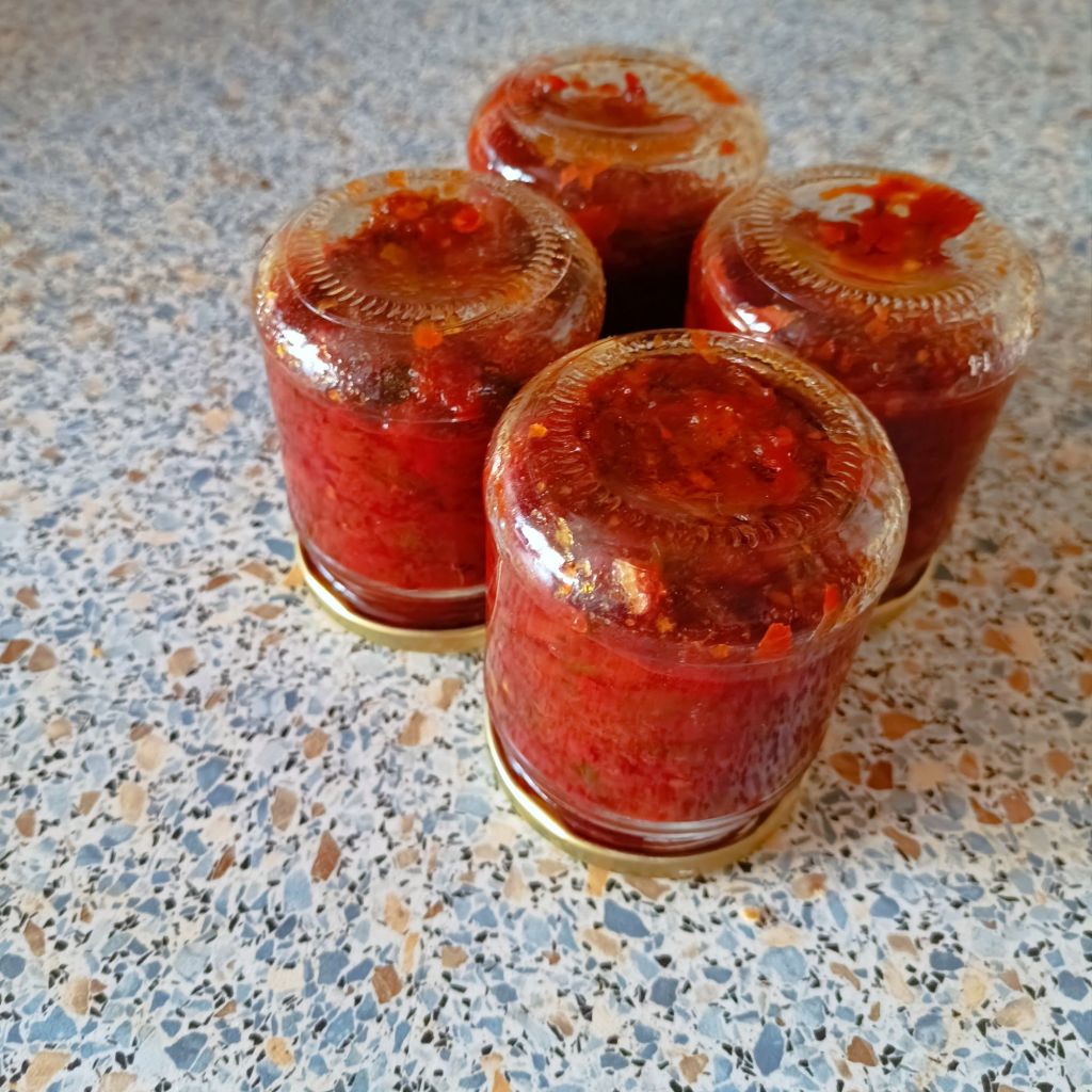 Here in Croatia 🇭🇷 this delicious relish (condiment, sauce, chutney, call it as you wish) is made only with tomatoes and peppers, in weight ratio 1:2. To get the proper taste, one also needs garlic, sunflower oil, apple vinegar, salt and sugar. Many add parsley, some add hot peppers or some other spices. It is slightly less work than ajvar, because of two reasons – it is not necessary to drain the peppers overnight (even if it can reduce cooking time), and more importantly it should not be fully smooth, so no grinding or blending required. It is still a bit of a labour of love, but this is mostly due to the time needed, not because being very complicated to make!