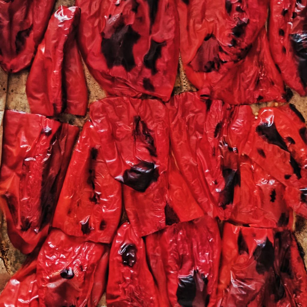Preheat oven to 200°C. Wash the peppers and the tomatoes. Remove the stems from the peppers, halve them, remove the seeds. Arrange on a baking tray lined with parchment paper, skin side up. Bake for ca. 35-40 min, until charred. Meanwhile, heat water in big pot and blanch the tomatoes.