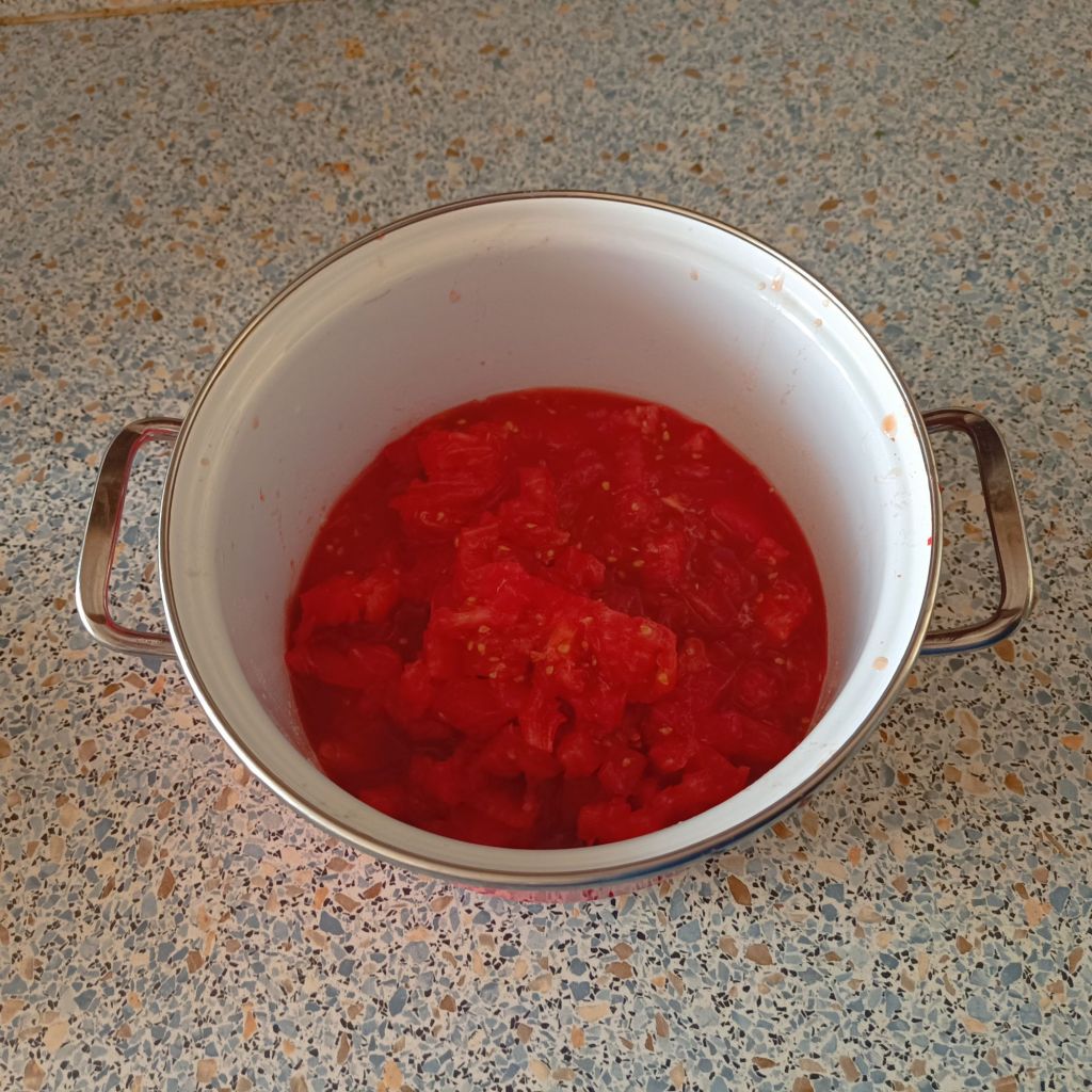 Transfer peppers to an empty pot, cover and leave for about 30 min. Peel the tomatoes, remove their stems and chop into small cubes. Transfer them into the pot in which you plan to cook your pinđur.