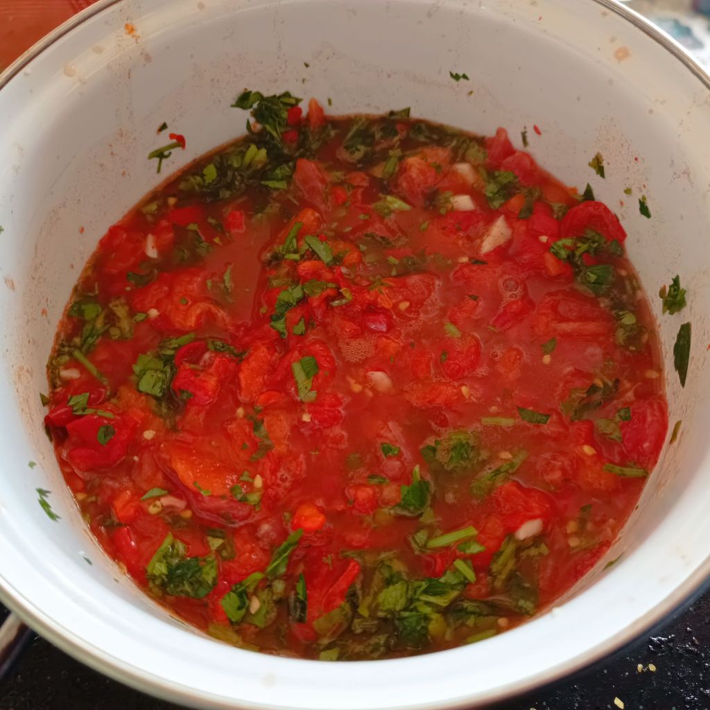 1.5 kg pointy red peppers of good quality 🫑, 0.75 kg ripe juicy tomatoes 🍅, 3 garlic cloves, 35 ml apple vinegar, 80 ml sunflower oil, a handful of chopped (straight-leaved) parsley, 1/2 tbsp salt, 2 tbsp sugar